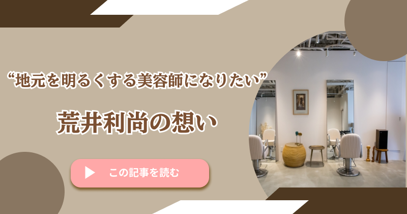 幼少期、地元の夏祭りで浴衣姿の人たちを見て「髪型や表情で人の印象は変わるんだ」と感じた瞬間、荒井利尚は美容に興味を持ちました。中学時代には、家族の髪を整えたり、友人にヘアアドバイスをするようになり、周囲からの「ありがとう」という言葉が荒井利尚の励みになっていきました。